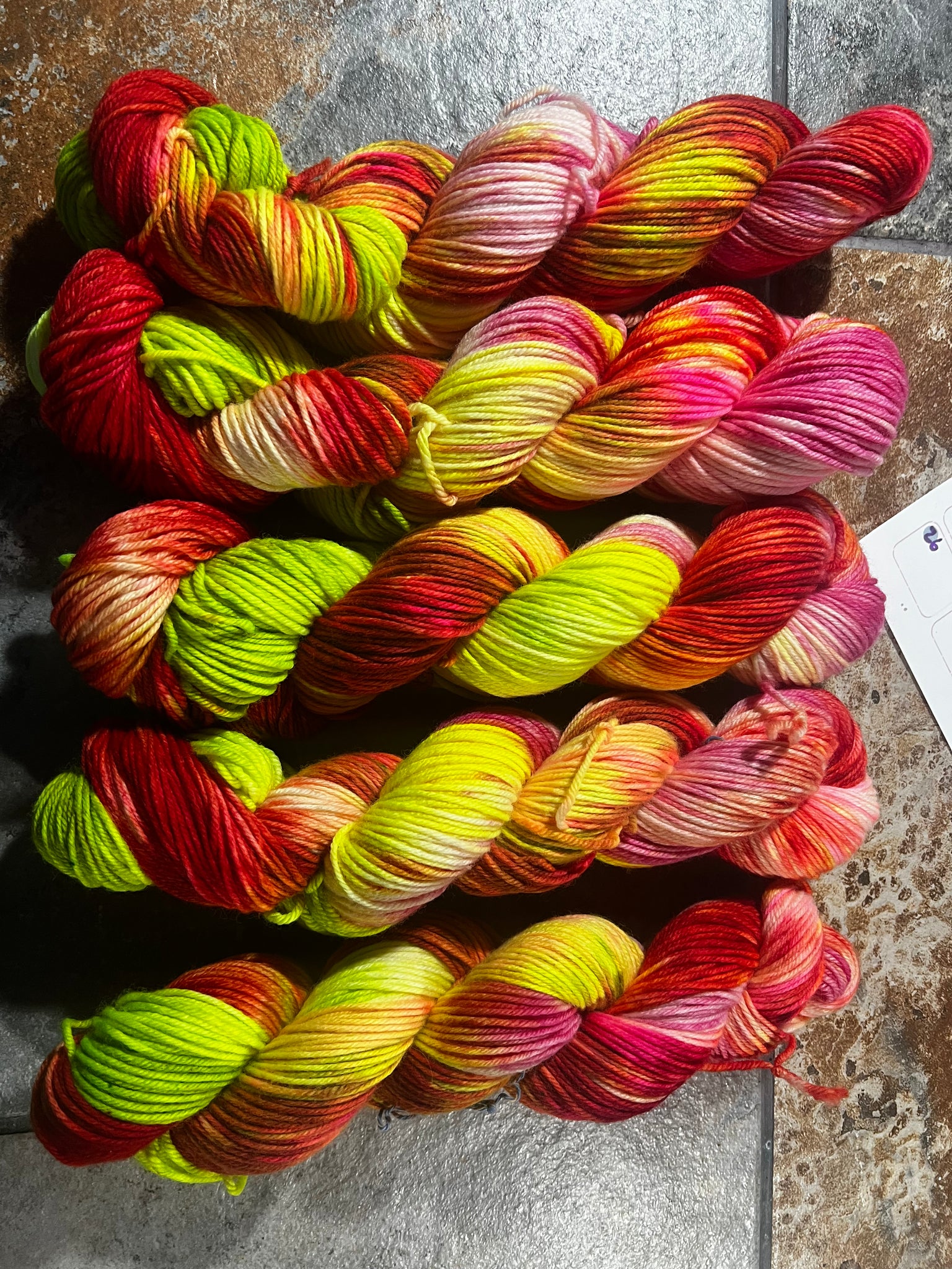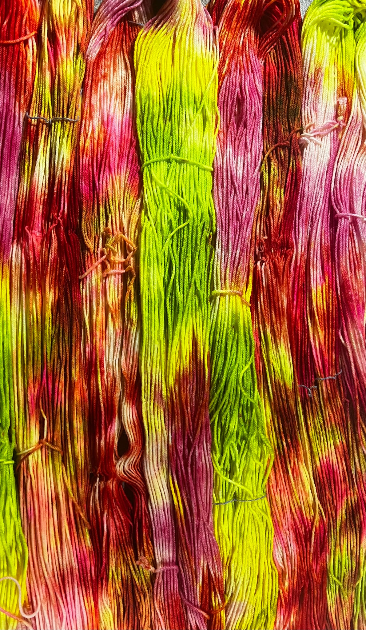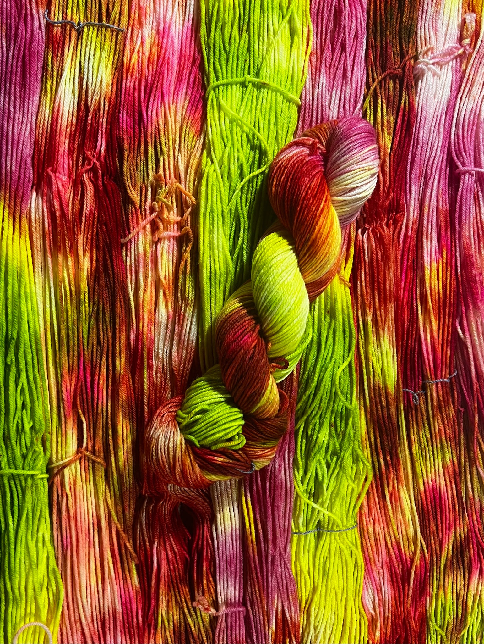 One day I came across this picture of a lady with dreads that were this orange fire red with little splashes of lime, yellow, and neon blue. I decided I had to make a yarn that looked like it. Jokes on me because I forgot what I was doing mid dye and changed the color breaks up completely. Hair and adhd… it’s how we get things done around here